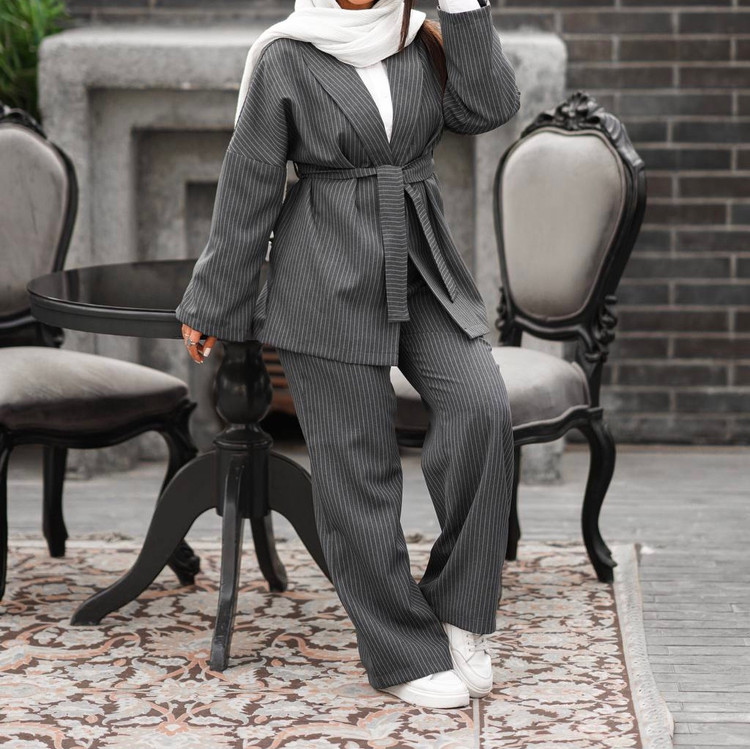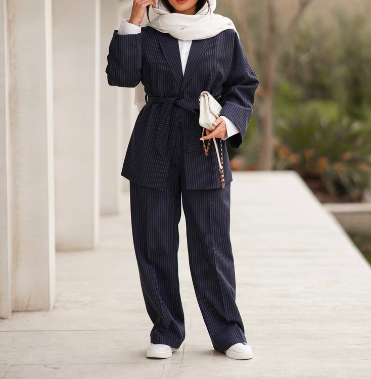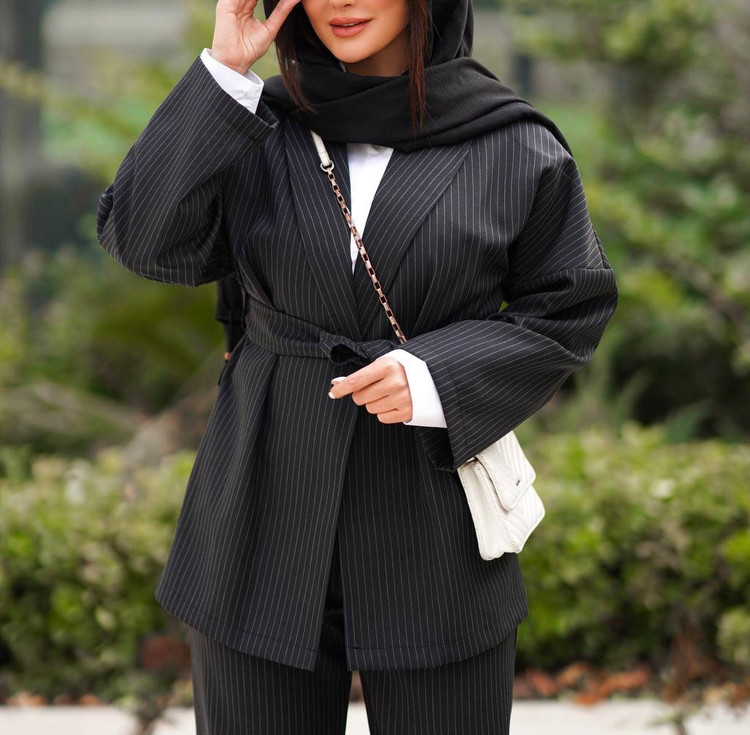 کت یقه آرشال کمربند دار و شلوار بگ راسته